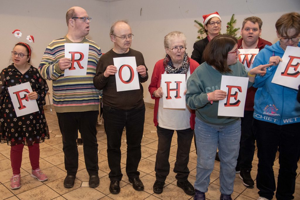 Der Raum füllte sich nun schlagartig mit sage und schreibe 33 Chormitgliedern, geleitet von Vize-Dirigent Gerhard Umhauer. Hanne Vettel von der Harmonie Heppenheim fand einmal mehr stimmungsvolle Grußworte an die Lebenshilfe-Mitglieder. Der Chor, geleitet von Vize-Dirigent Gerhard Umhauer, setzte mit „Du gnadenreiche Zeit“, „Gloria, wir singen“, „Horch, wie hell die Glocken klingen“, „Weihnachtszauber“ und „Fröhliche Weihnacht überall“ einen würdigen Schlusspunkt unter einen tollen Nachmittag. Als gemeinsames Finale sangen dann alle „O du fröhliche“, erstmals in dieser Form musikalisch begleitet von einem nach eigener Aussage „total aufgeregten“ und gleichzeitig ergriffenen Johannes Wemmer, der diese unerwartete Herausforderung jedoch bravourös meisterte.
